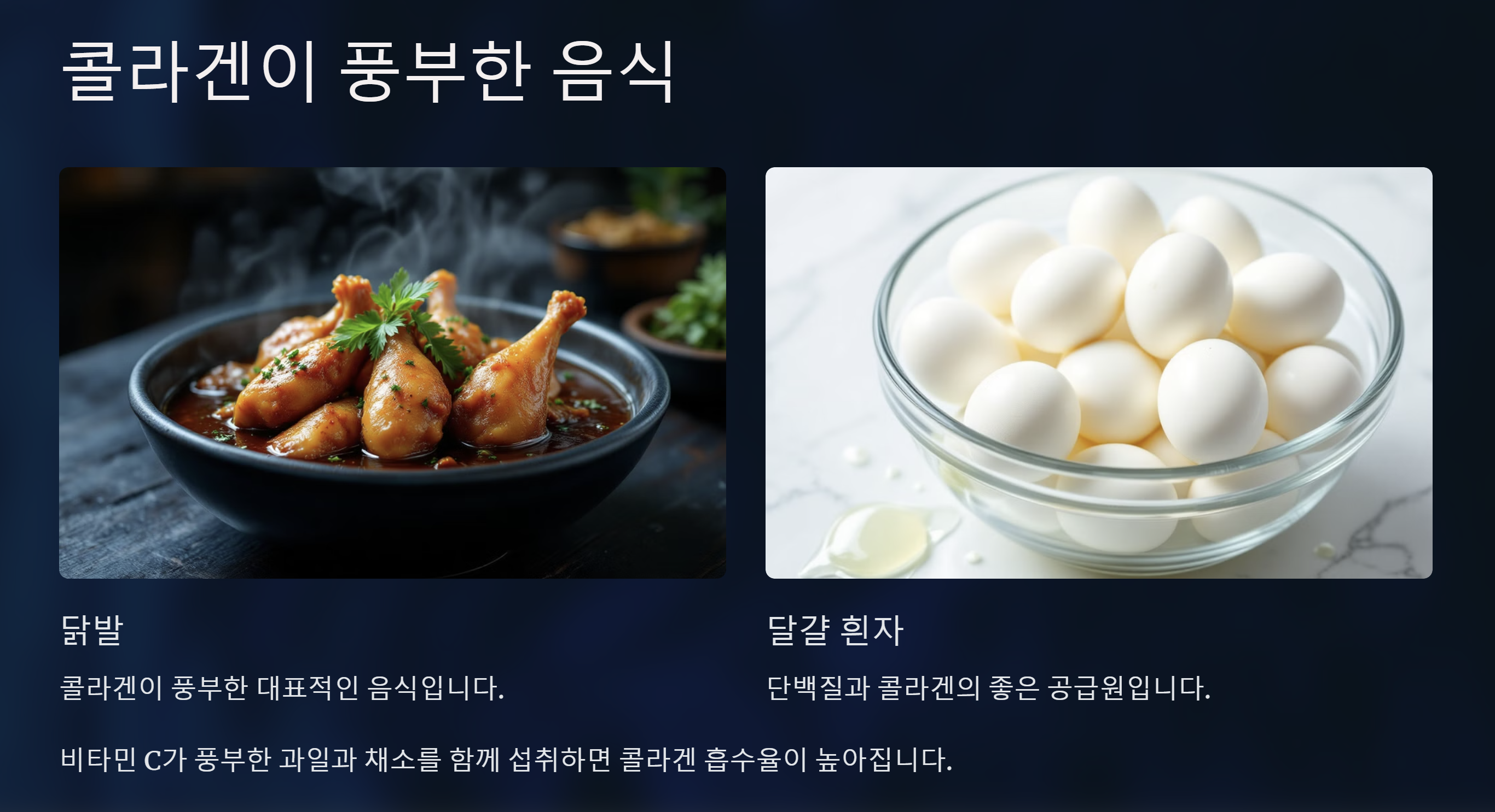 콜라겐 생성에는 비타민 C가 필수입니다. 오렌지, 레몬, 브로콜리 등 비타민 C가 풍부한 음식을 함께 드세요.